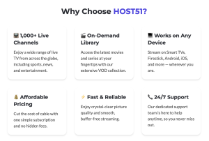 Unlike traditional television, IPTV offers more flexibility and control. You can watch on multiple devices such as smart TVs, Firesticks, Android boxes, tablets, and even smartphones. This means you’re never tied to a single location—you can take your entertainment with you wherever you go. Host51 provides reliable connections, minimal buffering, and crystal-clear picture quality so you can focus on enjoying your favorite content. Our subscription plans are affordable and designed to fit your lifestyle, giving you maximum value for your entertainment needs.